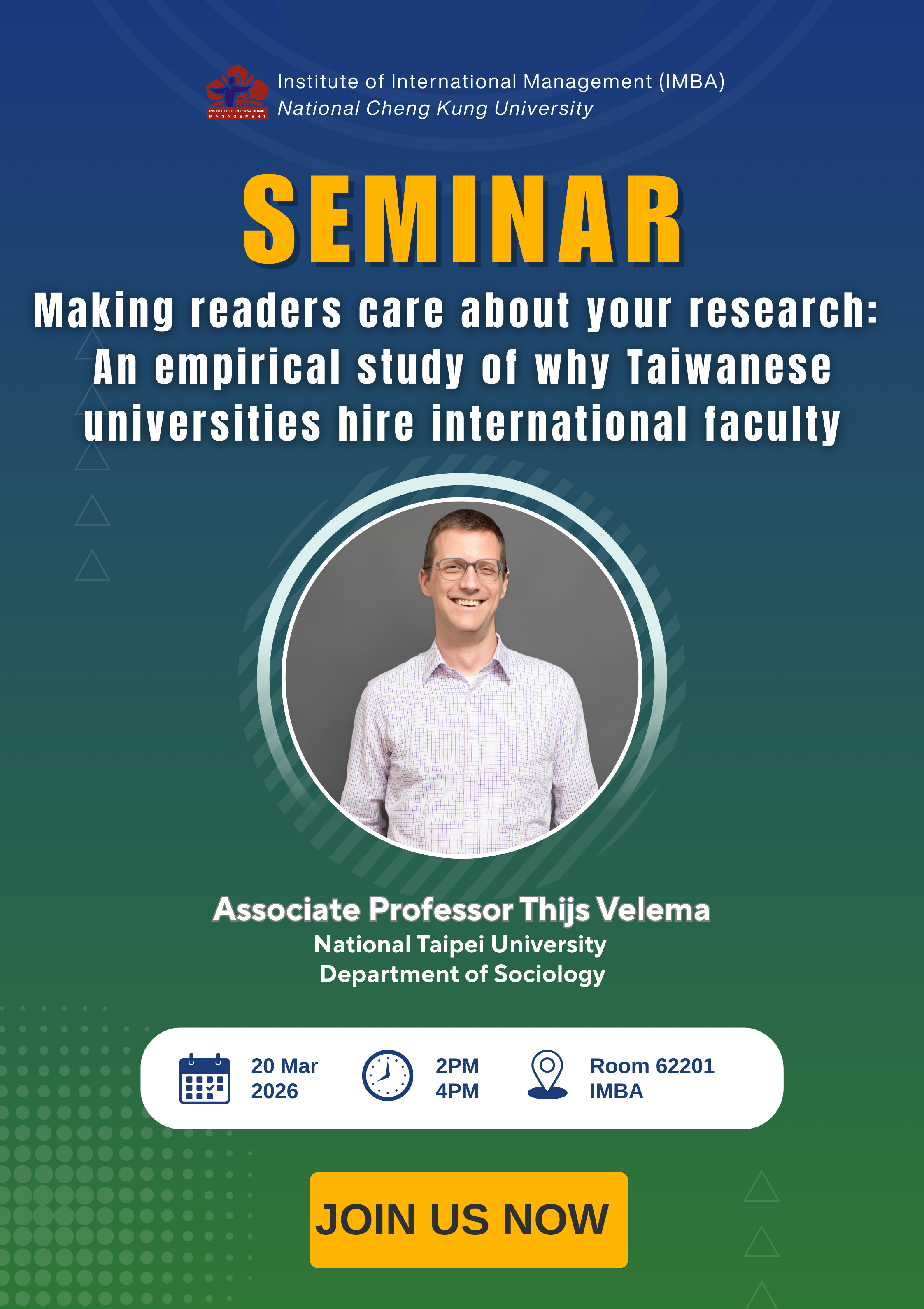 IMBA at National Cheng Kung University is excited to welcome you to our upcoming seminar: